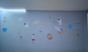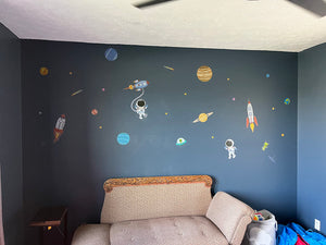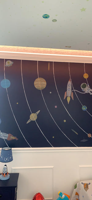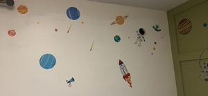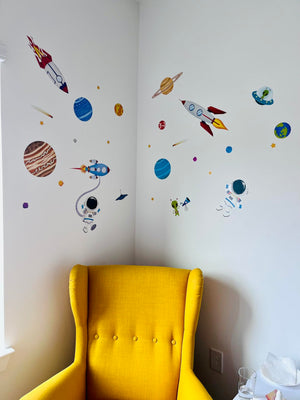 Met decalmile's muurstickers wordt elke muur een magisch ruimteavontuur. Kinderen worden omringd door planeten en raketten, waardoor hun verbeelding elke dag kan groeien en bloeien.